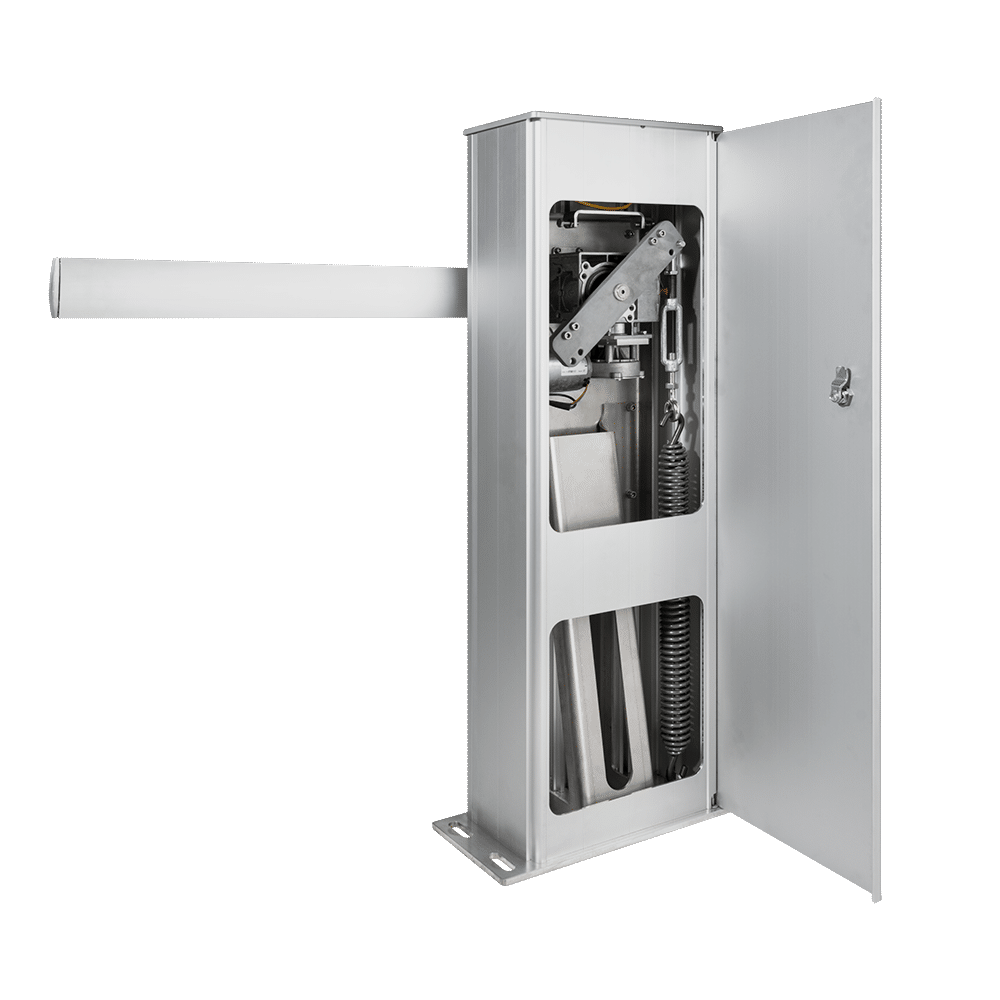 Robuste Schrankenserie, das Gehäuse ist aus einem stabilen Aluminiumgehäuse mit 4 mm Wandstärke und den Grundmaßen 350 x 200 mm gefertigt. Über die gerätehohe Tür ist das Antriebssystem und die Notentriegelung gut erreichbar.