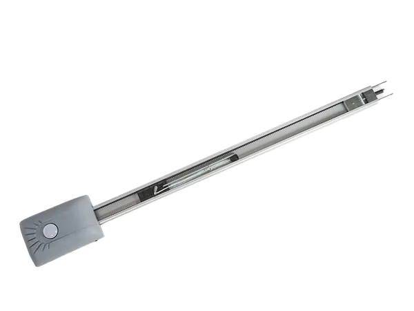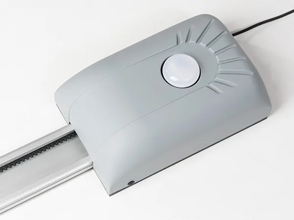 Hochwertiger Garagentorantrieb mit eloxierter Aluminium-Laufschiene und formschönem Design. In dieser Schiene sind Reedkontakte in moderner LED-Technik als Einstellhilfe verschiebbar integriert.